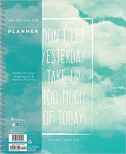 Organizing your life is easy with this Yesterday weekly/monthly planner, with quotes to help you realize the importance of living today to the fullest! This large, 9 x 11 inch planner boasts monthly, unlined grids for planning out an overview of your month ahead. Following the monthly planning pages, is an entire week's view of daily lined planning space. Inside pages are outlined with a soft gray and green color scheme with faux monthly tabs for easy access to planning as well as notes sections throughout. Bonus lined notes pages in the back and a year at a glance page included in the front. Planner is wire-o bound with durable front and back covers made of premium, textured paper. Academic year 12-month planner covers the months of July 2017 - June 2018.